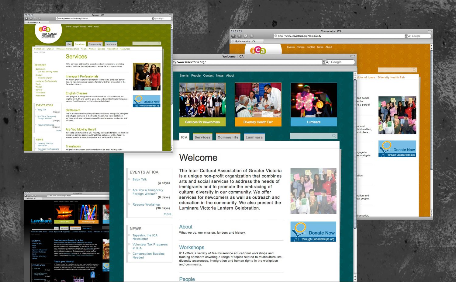Canadian design firm Rayola had to deliver a Drupal based site as part of an overall brand and communications upgrade for ICA – a non-profit agency committed to integrating, supporting, and celebrating new migrants. In fact two sites: ICA had a parallel web presence for its popular annual Luminara festival which it needed integrating. Together with Rayola’s Clint Hutzulak, (handing ID and print design) we designed a site with distinct tonal personalities in each section. Beneath the hood, the ICA build marked the point at which we began to systematize our CMS approach, developing our custom Lightwork base theme, and essentially a meta foundation that we still use today.